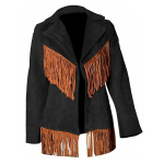 Women Suede Leather American Native Style Jacket Fringed – Black & Brown Fringes