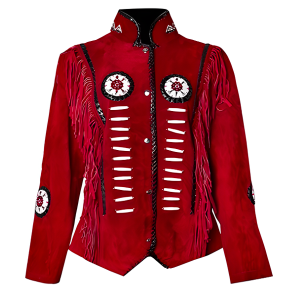 Women Native American Western Style Suede Leather Jacket Fringed & Beaded – Red