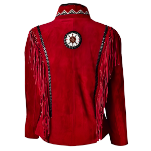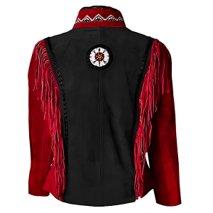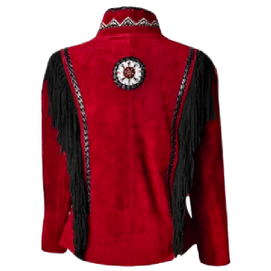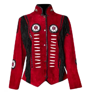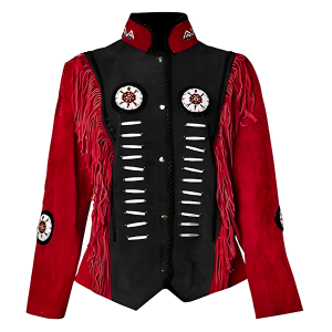 Women Suede Leather American Native Style Jacket Fringed & Beaded – Red & Black