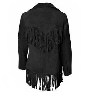 Women Suede Leather American Native Style Jacket Fringed – Black