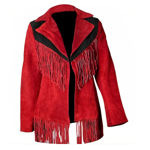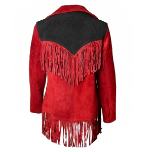 Women Suede Leather American Native Style Jacket Fringed – Red & Black