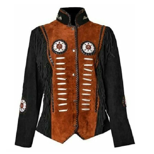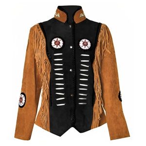 Women Suede Leather American Native Style Jacket Fringed & Beaded – Golden Brown & Black