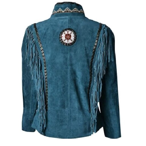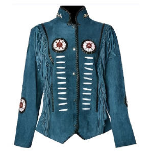 Women Suede Leather American Native Style Jacket Fringed & Beaded – Blue